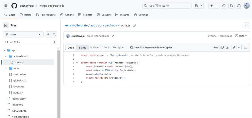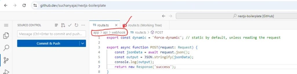 2. ในหน้า repo ของ Github กด (.) ในคีย์บอร์ด (หรือปุ่ม “ ใ “) สำหรับการเขียน โค้ต เริ่มต้นในการรับ API สร้าง folder ใน app/api/webhok/route.ts