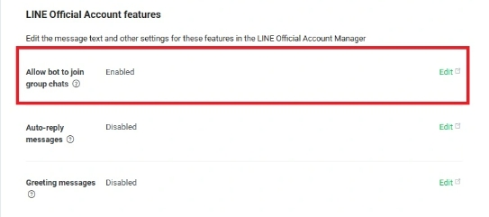 ** แต่ ก่อนที่ bot จะสามารถเข้า ไป Join ในกลุ่มได้ เราต้อง Allow bot to join group chats ก่อน โดยเข้าไป Allow ที่ LINE Official Account features ให้เป็น Enabled **