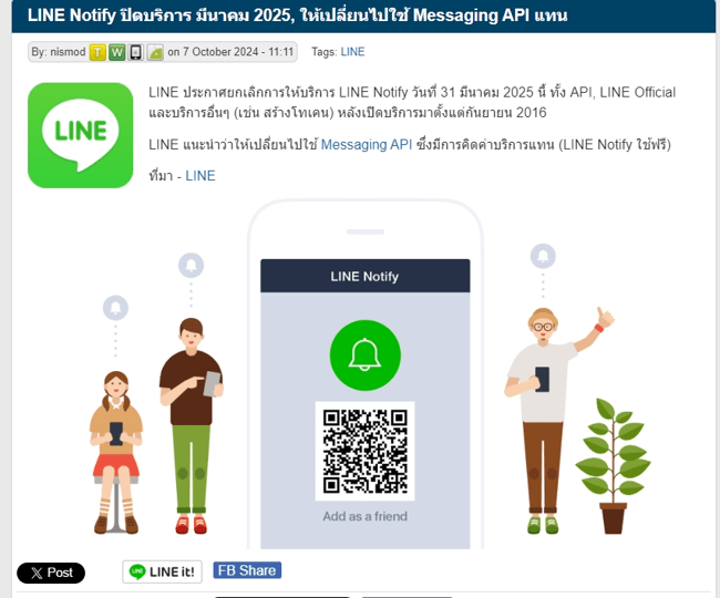 หลังจากใช้งาน Line Notify มาได้ประมาณ 3-4 เดือน โชคชะตาก็เล่นตลก 😅 ประกาศยกเลิกการให้บริการ ในวันที่ 31 มีนาคม 2568 ซะงั้น แล้วด้วยฐานสมาชิกอยู่ใน Line และสะดวกใช้งาน Line เป็นหลักจึงมีทางเลือกไม่มากคือต้องเปลี่ยนการใช้งานเป็น Line Messaging API