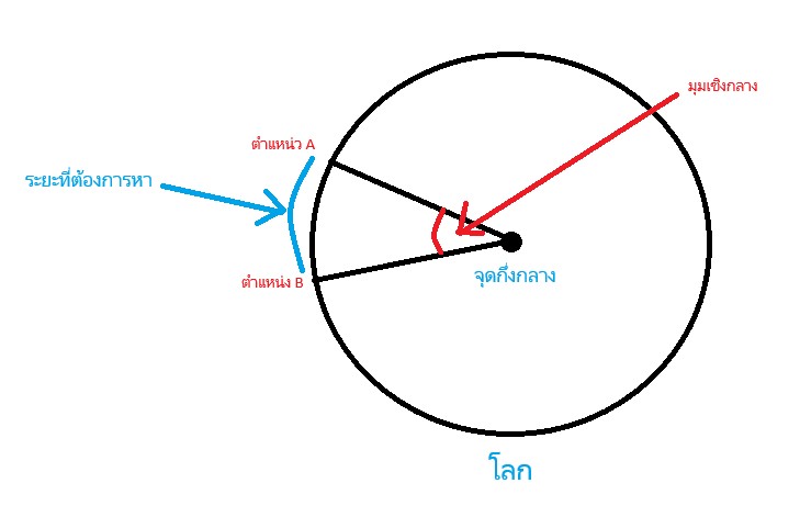 – ซึ่งใช้ในการคำนวณระยะทางเชิงมุมระหว่างจุดสองจุดบนทรงกลม ซึ่งหน่วยที่ได้จากการ ลบระหว่าง Lat และ Lon มีหน่วยเป็นเรเดียน