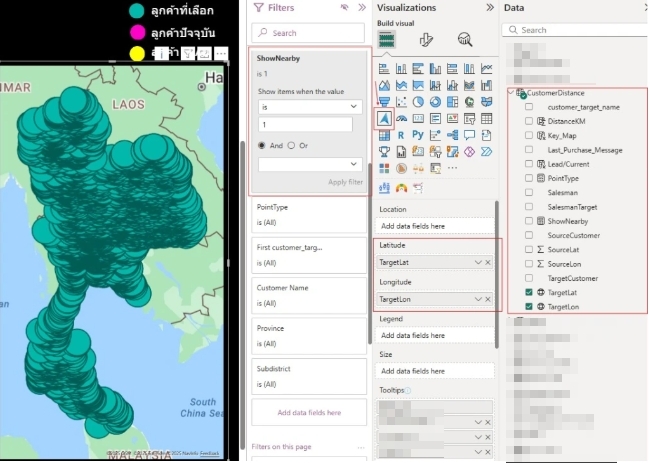 ในที่นี้พลอยใช้ Azure Map และใช้ Column TargetLat กับ TargetLon มาเป็นตัวแสดงผลบน Visuals จากนั้นเราจะลาก Measure ShowNearby มาไว้ตรง Filter และกำหนดให้เท่ากับ 1