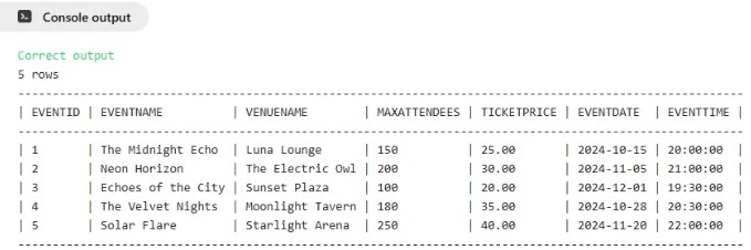 INSERT INTO EventSchedule (EventID, EventName, VenueName, MaxAttendees, TicketPrice, EventDate, EventTime)