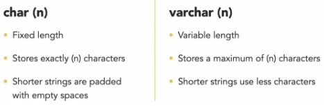 - ทั้ง char และ varchar ไม่อนุญาตให้ใส่เกินความยาวของ (n) ถ้าใส่เกิน ฐานข้อมูลจะส่งกลับข้อผิดพลาดและจะไม่บันทึกข้อมูลลงตาราง